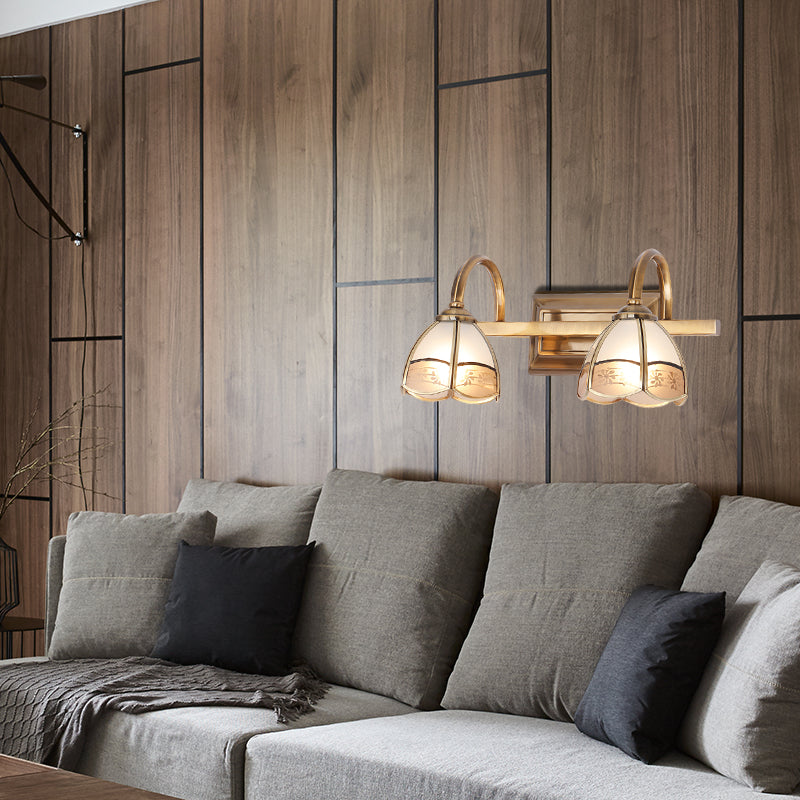 This product is a traditional brass metal vanity lamp fixture with a dome frosted glass shade. It measures 23 inches wide by 15 inches in diameter and is 9 inches high. The light uses either LED, incandescent, or fluorescent bulbs with an E26/E27 base. It comes with a 7.5-inch shade height.