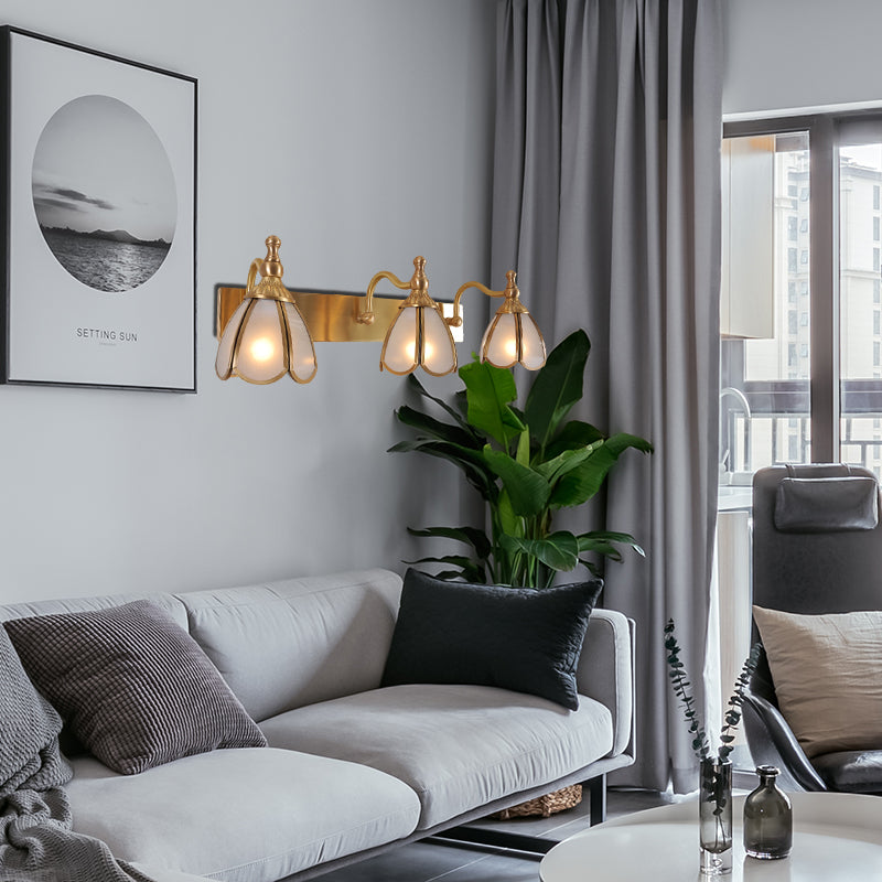 This wall light is a great addition to any bathroom. It is made of brass with a frosted white opal glass shade. The light is available in 1, 2, or 3 light options. It is also available in 110V-120V or 220V-240V.