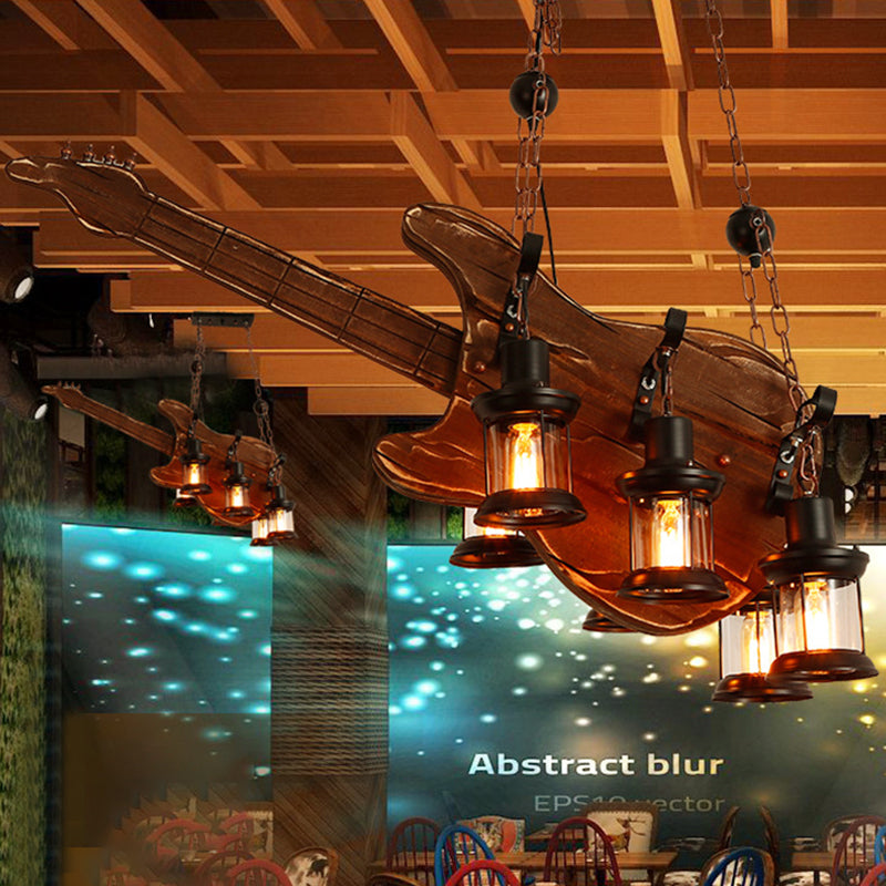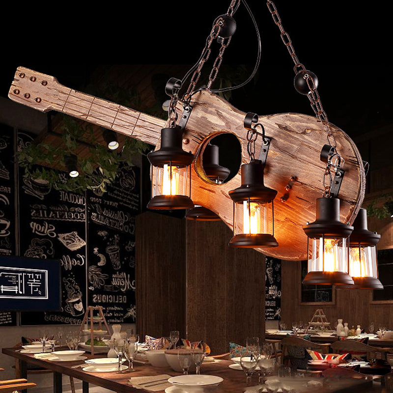 This is a 6-light chandelier made of clear glass and wood. It is designed for use in living rooms, and has a Coastal Brown finish. The chandelier hangs from a chain or cord, and has a fixture width of 37.5" to 42" and a height of 14". The light bulb is not included, but the chandelier is compatible with LED, incandescent, and fluorescent bulbs.