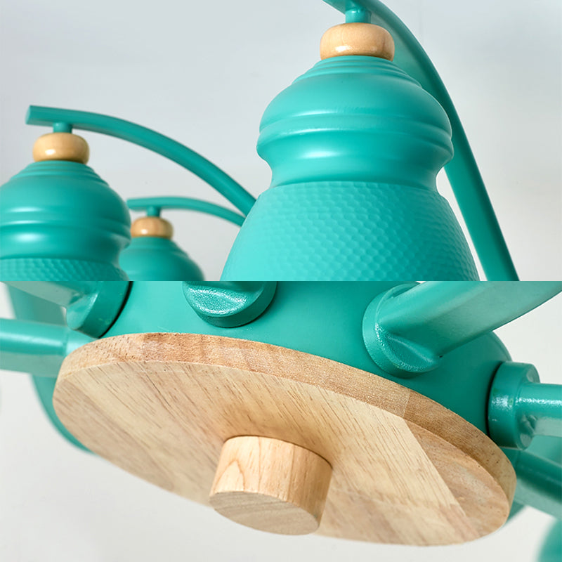 The product is a metal chandelier in a modern design. It is available in grey, green, and white. It comes in three sizes: 25", 31", and 34.5". It has a maximum bulb wattage of 39 watts. It is also available in a 110V-120V or 220V-240V. The bulb base is E26/E27. The light type is LED/Incandescent/Fluorescent.