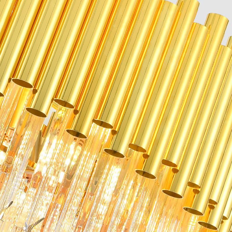 This chandelier light is made with a metal frame and round shade that is decorated with brass detailing. The shade is made of crystal blocks that emit a bright, LED light. This chandelier light is perfect for adding a touch of elegance to any room.