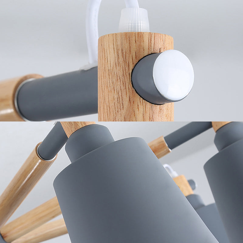 This is a Macaroon Hanging Lamp Fixture Tapered Shade Metal Hanging Light. It is ideal for living room with a size of 25 Inch & Above. The fixture width is 31", fixture height is 19", and the chain/cord length is 12". The light is LED/Incandescent/Fluorescent with a voltage of 110V-120V 220V-240V. The bulb base is E26/E27. There is no bulb included. The light color is blue grey green pink yellow. The number of lights is 6. The style is kids. The material is metal. The number of tiers is 1 tier. The shade direction is down. The shade color is blue gray green pink yellow.