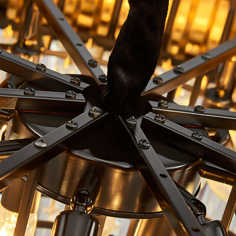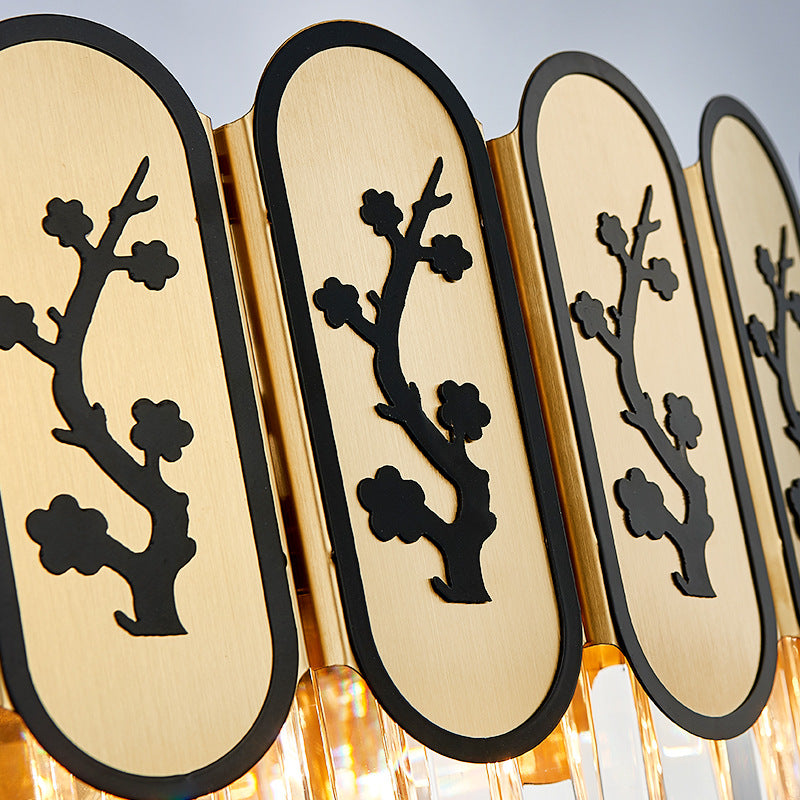 The product is a chandelier that is made out of crystal and metal. It is in the shape of a flower and is brass-colored. The chandelier is 31.5 inches wide and 23.5 inches tall. It comes with a 19.5-inch-long chain and cord. The chandelier can use LED, incandescent, or fluorescent bulbs (not included) and has a voltage of 220-240V for 110-120V.