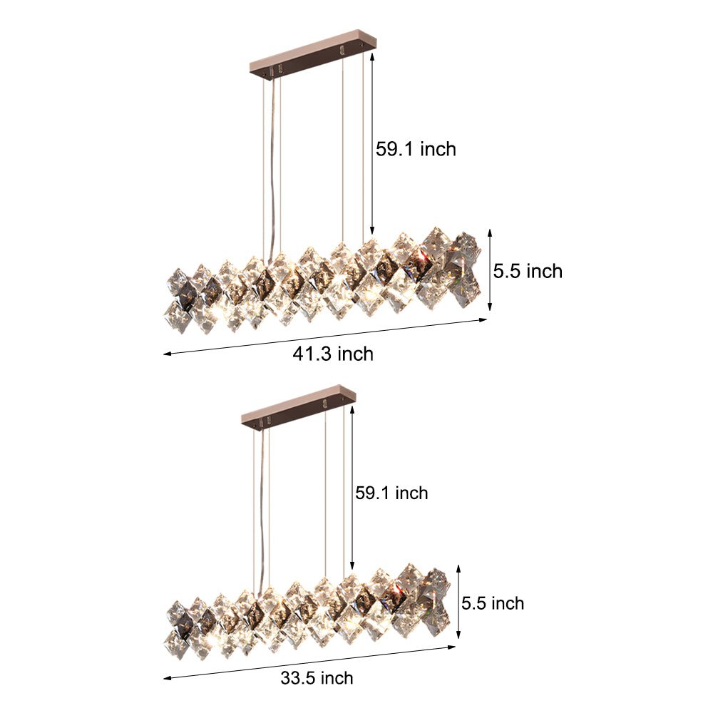 SPECIFICATIONS • Round Options: – Option 1: 17.7" diameter × 7.9" height; approx. 17.63 lb – Option 2: 21.7" diameter × 7.9" height; approx. 30.86 lb – Option 3: 29.5" diameter × 7.9" height; approx. 39.68 lb – Option 4: 37.4" diameter × 7.9" height; approx. 50.70 lb • Long Options: – Option 5: 33.5" width × 6.3" depth × 5.5" height; approx. 30.86 lb – Option 6: 41.3" width × 6.3" depth × 5.5" height; approx. 44.09 lb • Hanging Wire: Adjustable up to 59.1" • Material & Finish: Electroplated hardware with K9 crystal accents • Light Source: E14 bulbs (not included) • Color Temperature: 3 step dimming (3000 K / 4500 K / 6000 K) • Voltage: 110 V or 250 V (non-polarized) • Working Temperature: –20 °C to 60 °C • Installation Type: Ceiling mounted, hardwired • Maintenance: Wipe clean with a soft dry cloth