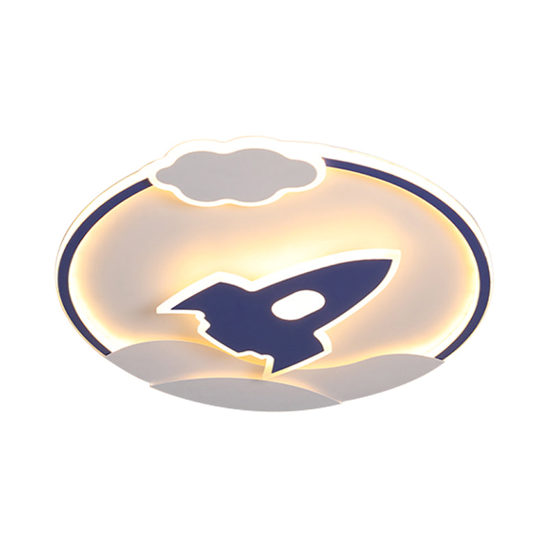 This product is a blue, space rocket-themed thin flushmount lamp made of acrylic and LED. It is designed for children's bedrooms and emits warm/white light. It is close to the ceiling and measures 15 to 19 inches in size. The fixture width is 16 inches, the height is 2 inches, and the maximum bulb wattage is 39 watts. The voltage is 220V-240V 110V-120V.