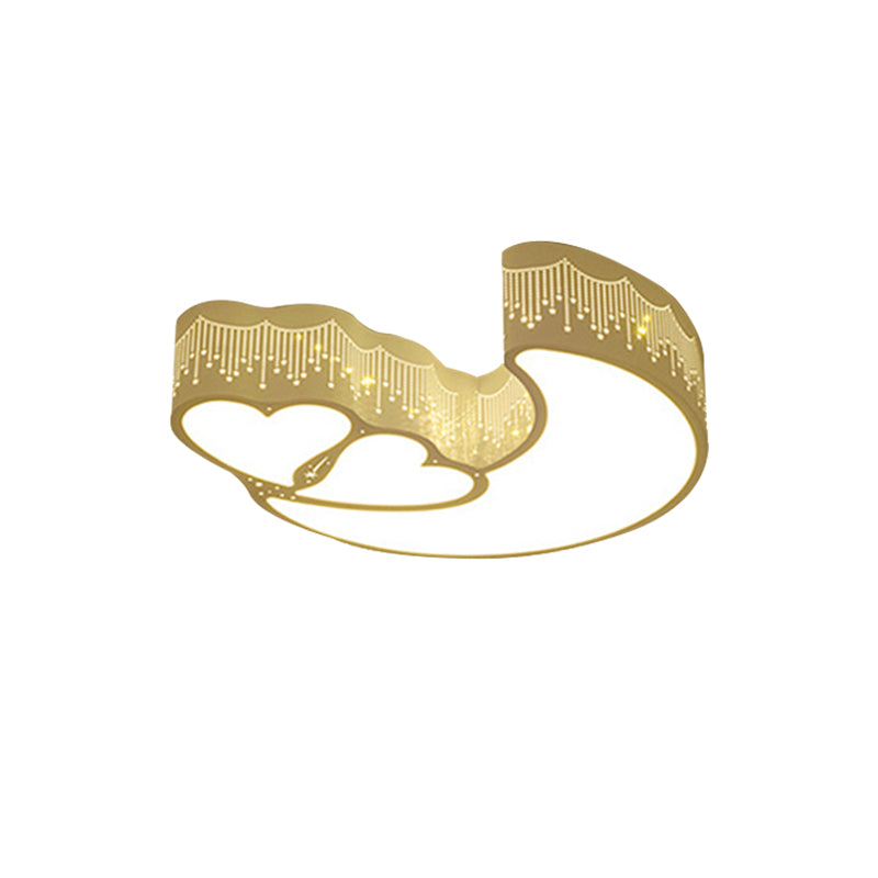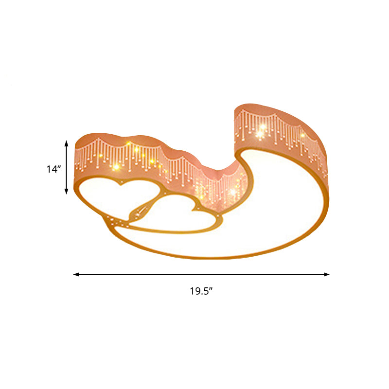 This product is a ceiling light created with the intention of providing illumination for kids' bedrooms. The light is designed in the shape of a cartoon moon with a heart in the center. It is made from acrylic and metal, with an LED light source. The light has a flushmount design and can be dimmed via remote control. It is also available in two different color temperatures, 110V-120V and 220V-240V.