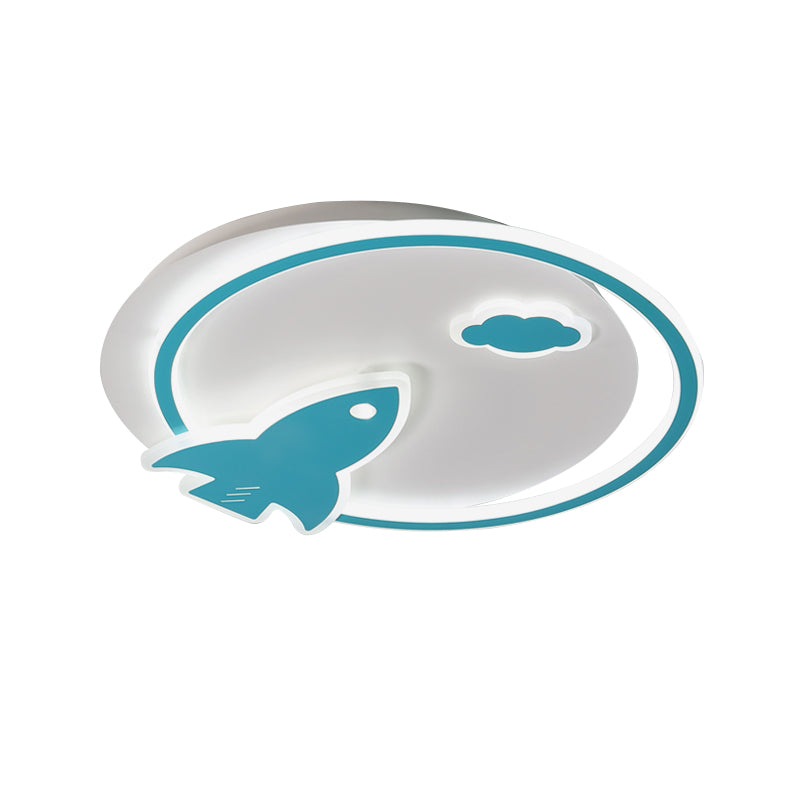 This product is a Spaceship-shaped acrylic thin flush light LED close to ceiling lighting fixture in blue. It is a kids' style light, and the color temperature is warm. The voltage is either 220-240V or 110-120V, and the bulb base is SMD. The light type is LED. The maximum bulb wattage is 39 watts or under.
