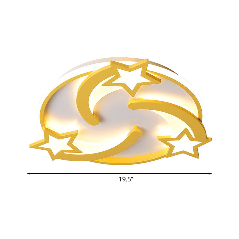 This product is a Kids Star Flushmount Lighting Acrylic 16"/19.5" Wide LED Bedroom Flush Mount Ceiling Light Fixture in Yellow. It is a ceiling light fixture that is made of acrylic and is LED. The light is yellow and the fixture is flushmount. The dimensions of the product are 19.5" 16" for the width and 2" for the height. The product also has a voltage of 220V-240V and a bulb base of SMD.