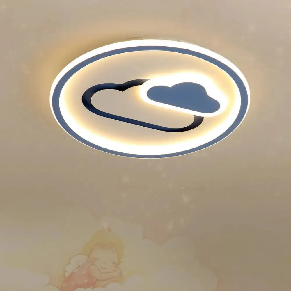 This product is a kids style cloud flush mount light made of acrylic. It is 16"/19.5" wide and 2" tall. The light is LED and SMD base. The light is available in pink, blue, and black.