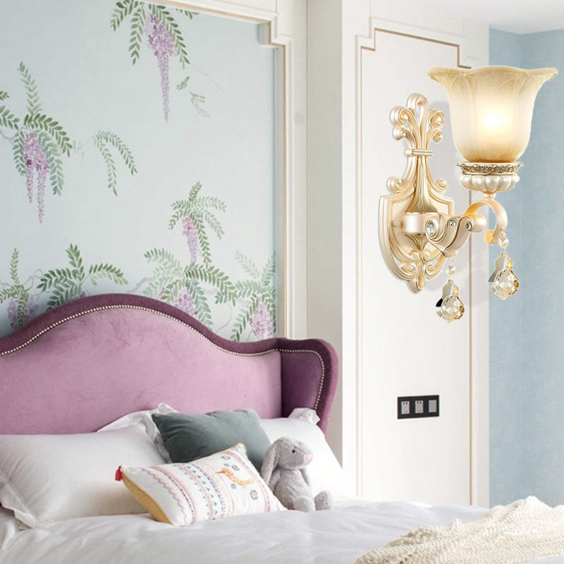 This beautiful and elegant Ruffled Floral Beige Glass Wall Lamp is the perfect addition to any living room. With its traditional retro style and crystal draping, this wall light fixture will bring an unparalleled sophistication to your home. It features a stunning design with a classic beige color, featuring both floral and ruffled detailing. The fixture is made out of high-quality resin and comes with a solid glass shade with intricate design details.