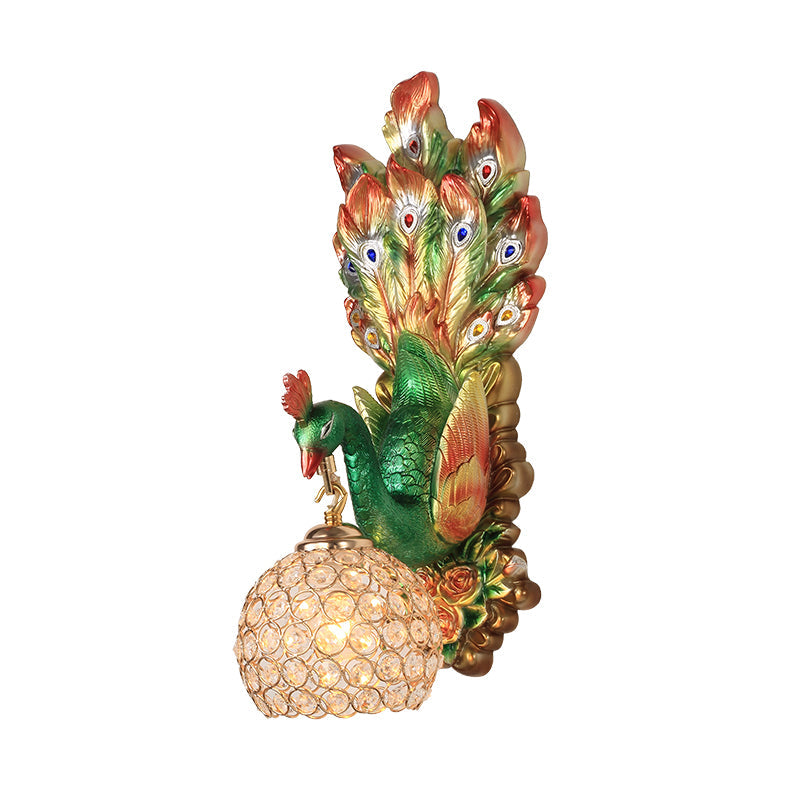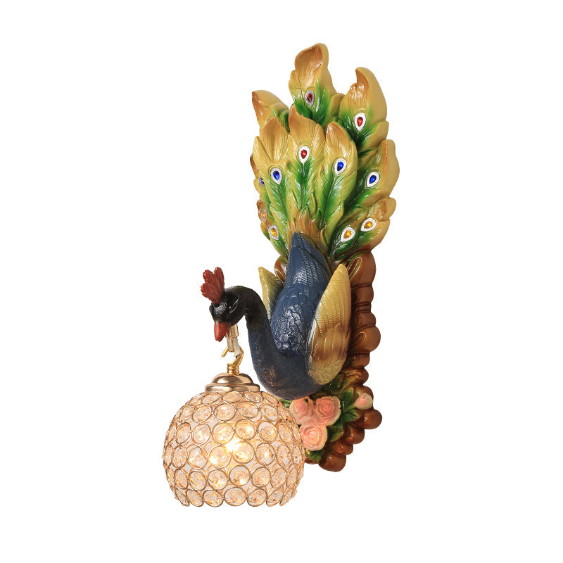 This product is a unique wall sconce that is made up of a clear faceted crystal that has a peacock designed etched onto it. The product comes in three different colors: blue, green and gold. There is also a choice of size for this sconce, 5 to 9 inches. It is a direct wired electric wall lamp that has a voltage of 220V-240V or 110V-120V. This sconce requires one light bulb, which is not included in the purchase. This lamp is perfect for any traditional styled home.