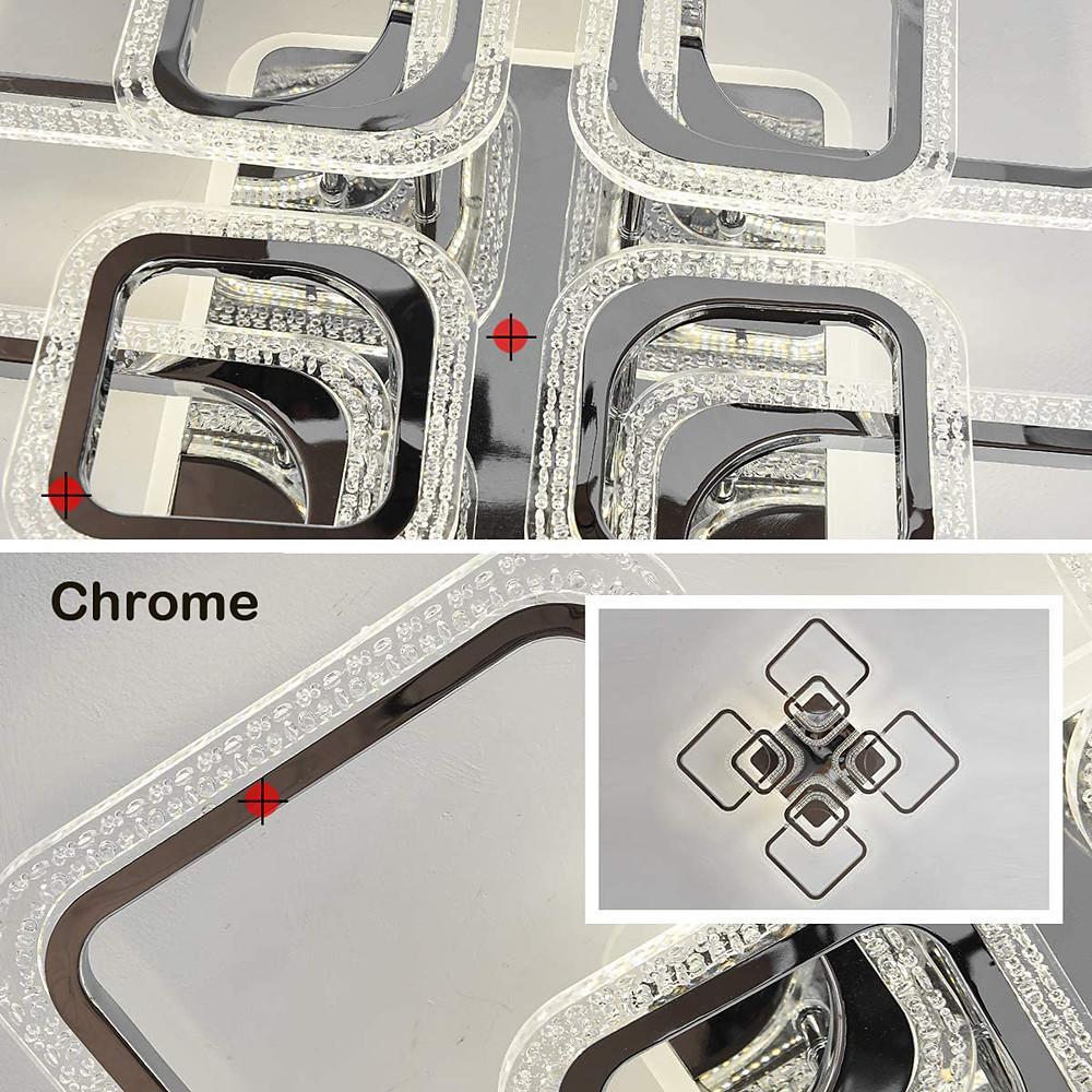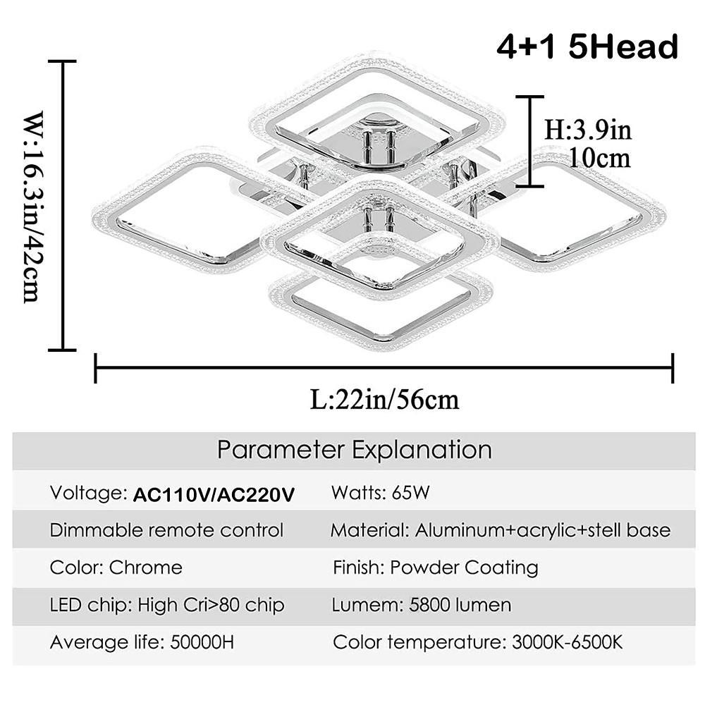 KEY FEATURES • Unique two-layer, five-square geometric design for a striking modern look • High-quality acrylic shades with painted metal accents for durability and easy maintenance • Integrated LED light source included; offers warm white (3000 K), neutral white (4500 K), or cool white (6000 K) • Flexible lighting with 3-step dimming (switch controlled) and remote-controlled dimmable option (3000 K–6000 K) • Voltage: 110 V or 250 V (non-polarized) • Working Temperature: –20 °C to 60 °C
