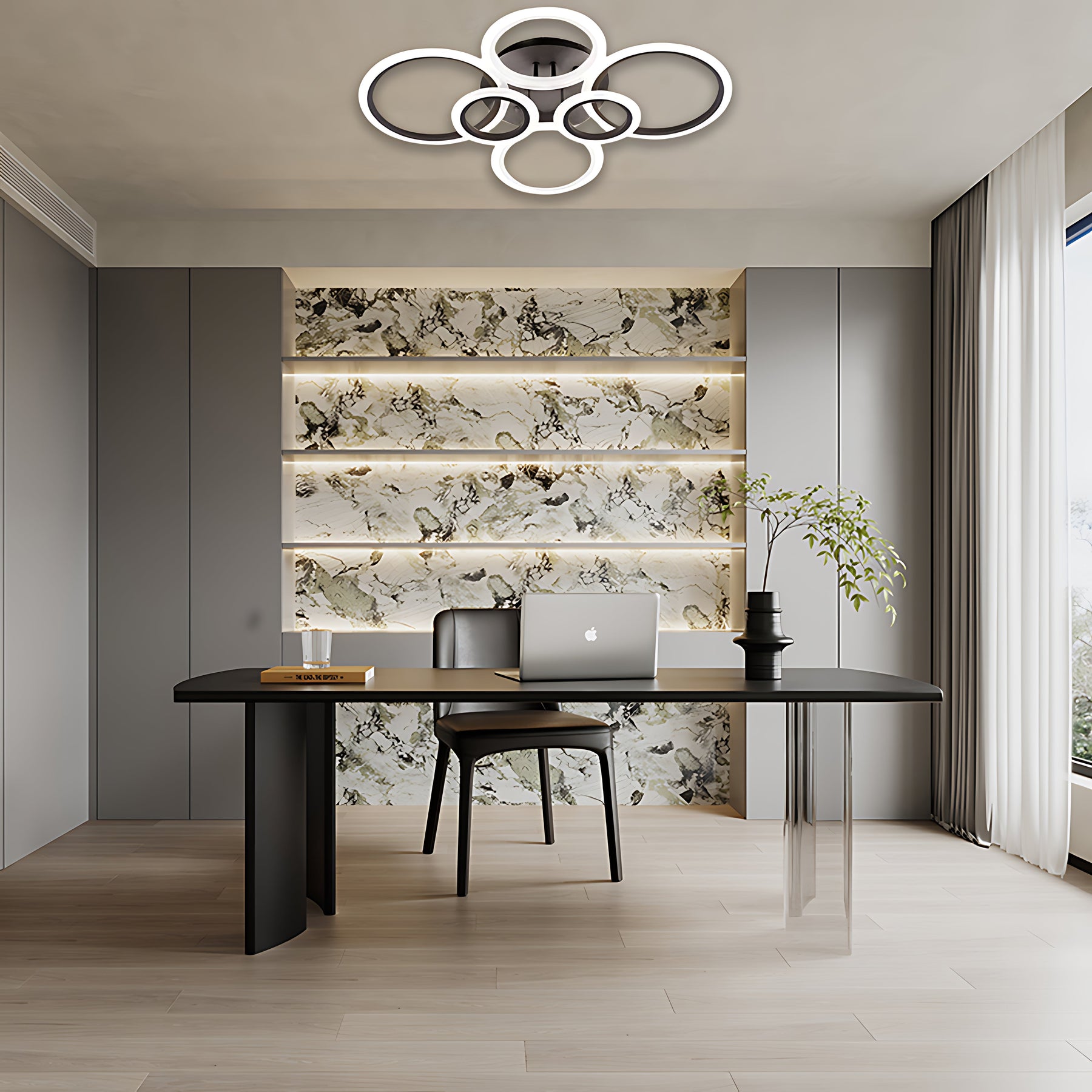 This contemporary ceiling light features a creative cluster of interlacing circles in a double level design. Crafted from premium aluminum with a high quality acrylic shade, it provides bright, even illumination and serves as a decorative focal point day or night. With an adjustable color temperature range of 3000 K to 6000 K, it easily adapts to various moods and room settings.