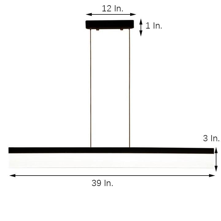 • Modern elongated linear pendant with slim rectangular form • Light Source: LED bulbs – bright, energy-saving, and long-lasting • Dimensions: 39" width × 0.47" depth × 3" height; 59" adjustable cord • Power: 20W, designed for illumination areas of 54–108 sq. ft. • Aluminum frame with painted finish and acrylic shade • Color temperature options: Warm White (3000K) / Cold White (6500K) • Voltage: 110V or 250V (non-polarized) • Lightweight at 4.41 lb, easy to install
