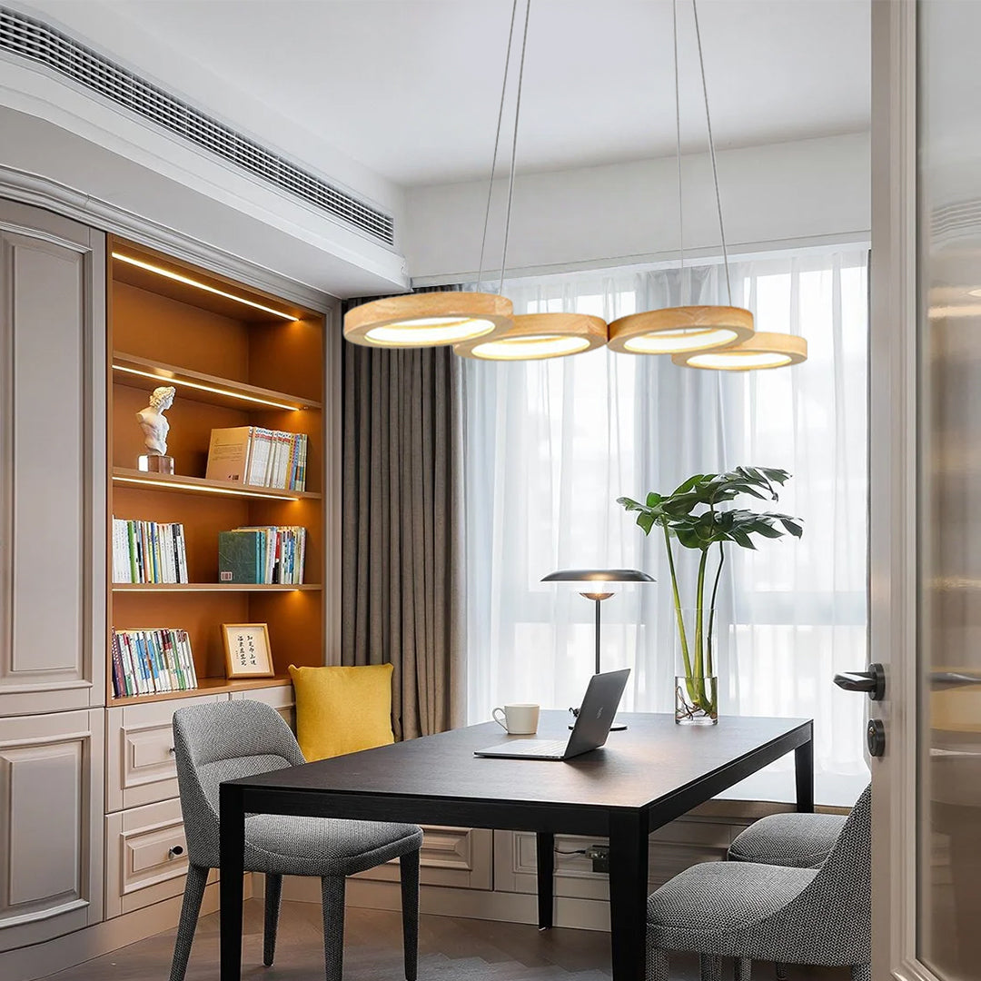 • Bring warmth and modern farmhouse charm into your home with this Rustic 4-Circle Wood LED Chandelier. Its sturdy wooden lamp body and high-transmittance acrylic shades create a balance of durability, rustic elegance, and bright illumination. Perfect for both decorative and functional use, this chandelier elevates any interior with its unique circular frame design. The adjustable suspension makes it adaptable to different ceiling heights, while the integrated LED lighting ensures energy efficiency and long-lasting performance.