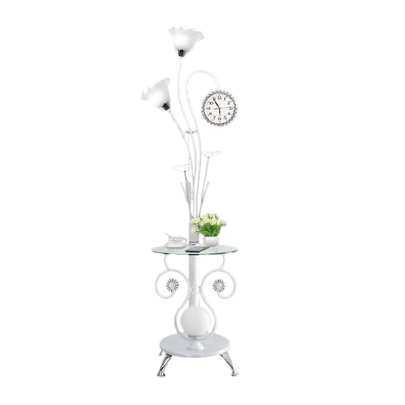 This product is a 2-head tree shaped standing floor lamp in a rural style. Black/White metallic floor light for bedrooms. It is made of metal and has a white shade. The size is 16 to 17 inches wide and 60 to 69 inches tall. The voltage is 220v-240v or 110v-120v. The base is E26/E27. The light type is LED/Incandescent/Fluorescent.