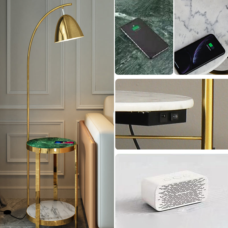 This floor lamp is made from metal and features a modern design. It is available in black gold, black gold green, and white colors. The lamp has a 2-tiered tray that is perfect for holding books or magazines. The light type is LED, incandescent, or fluorescent. The voltage is 110V-120V or 220V-240V. The bulb base is E26/E27.
