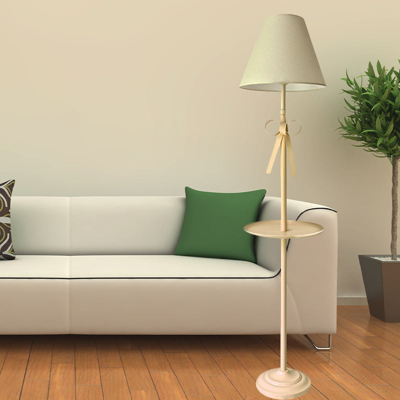 This product is a floor lamp that is pink and yellow. It is made out of metal and has a barrel shaped shade. The shade is made out of fabric and is yellow and pink. The light type is LED, incandescent, or fluorescent. The bulb base is E26/E27. The voltage is 220V-240V 110V-120V. The height is 63 inches. This product is for children and is a conical standing floor light.