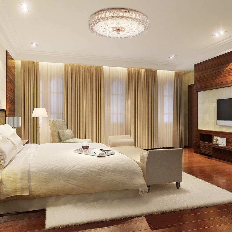 This sophisticated and luxurious flush light will update the look of any space. It features a round design, 16 inches/19.5 inches wide with a metal drum shade finished in a stunning gold color. The intricate design is crafted from crystal for the beautiful peacock tail/flower pattern. It also includes a bulb for convenience with a 3 color temperature, SMD LED light type and 110V-120V/220V-240V voltage. This graceful flush-mounted ceiling light is perfect for any modern or traditional home and will make a great statement in any room. Its high quality materials and craftsmanship make it perfect for home decor or for use in a hallway, living room, bedroom, bathroom, dining room, kitchen, hallway, etc. The perfect lighting for a chic stylish home.