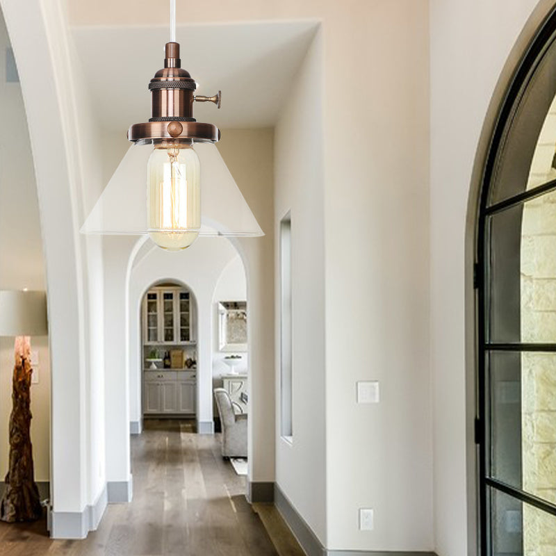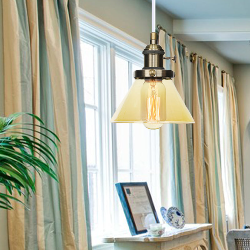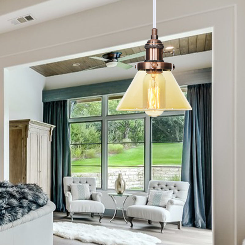 This vintage style hanging light fixture features a conical design withamber/clear glass and metalMaterial. It is available in black/bronze/brass finish and supports 1 headlight.The light type is LED/Incandescent/Fluorescent. The voltage is 110V-120V or 220V-240V. The fixture dimensions are 5 to 9 inches in size, 6 inches in width, and 6 inches in height. The chain/cord length is 39 inches. The canopy width is 5 inches. The bulb is not included.