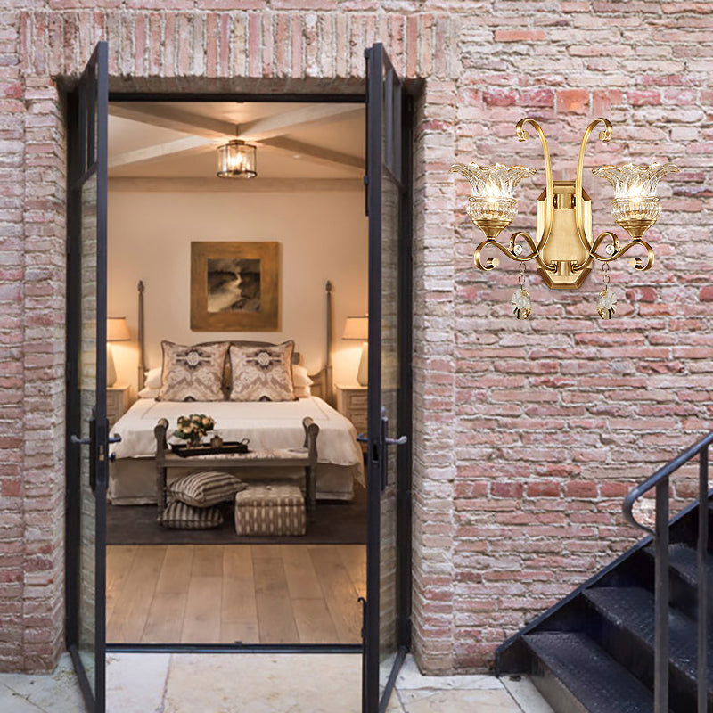 Impress your family and guest with this one-of-a-kind wall lamp. The Flower Sconce Light Fixture Modern Clear Glass 1/2 Lights Brass Wall Lamp with Crystal Accent is perfect for adding a touch of luxury and timeless style to any home. Add this unique and stylish design to your living room, entrance hall, kitchen, or bedroom and instantly elevate the look and feel of the space.