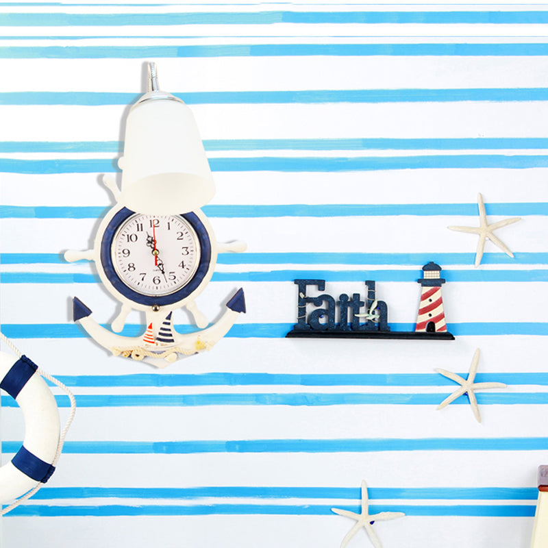 This delightful sconce features a magnificent glass bell shade, topped with an adorable anchor clock, that is sure to bring a touch of coastal charm to any space. The shade is 5 to 9 inch in diameter, with a 15 inch height, and is made from elegant glass. It has a medium base socket that is compatible with E26/E27 bulbs, and can accommodate a variety of LED, Incandescent, and Fluorescent bulbs. The wall lamp has a 9 inch diameter that extends outwards from a circular backplate to a pole which is 15 to 19 inch in height. The entire fixture is made of durable plastic and is available in a classic white color. This light fixture is rated 220V-240V 110V-120V and is perfect for whatever your lighting needs. With its timeless design, this light will fit into a variety of settings, be it in a bedroom, hallway, living room, kitchen, hotel room, or any other place. The Kids style perfectly complements any Mediterranean-inspired decor, and the 1 light will guarantee your space is illuminated evenly and brightly. This delightful wall lamp is sure to bring a touch of coastal charm to any space.