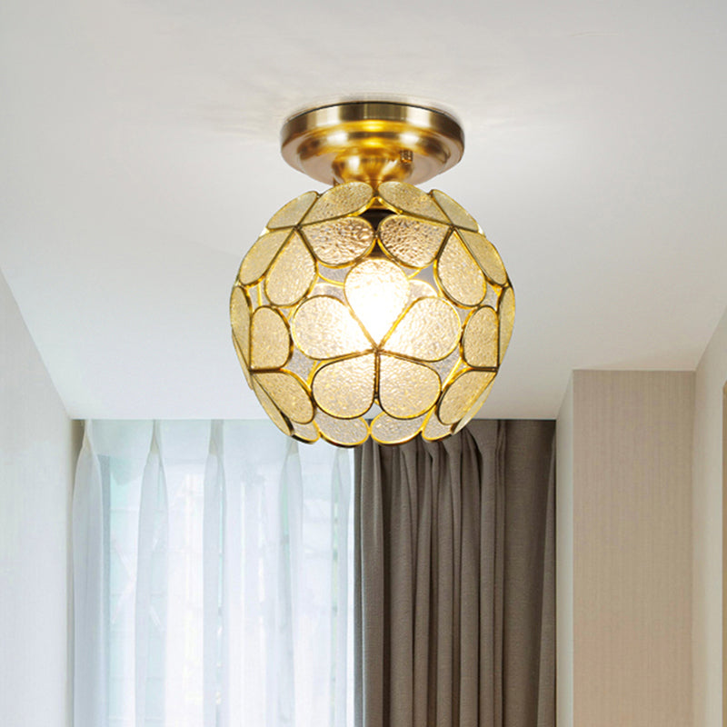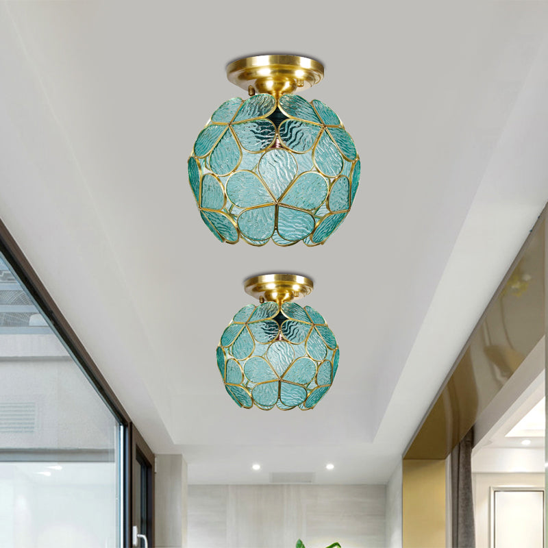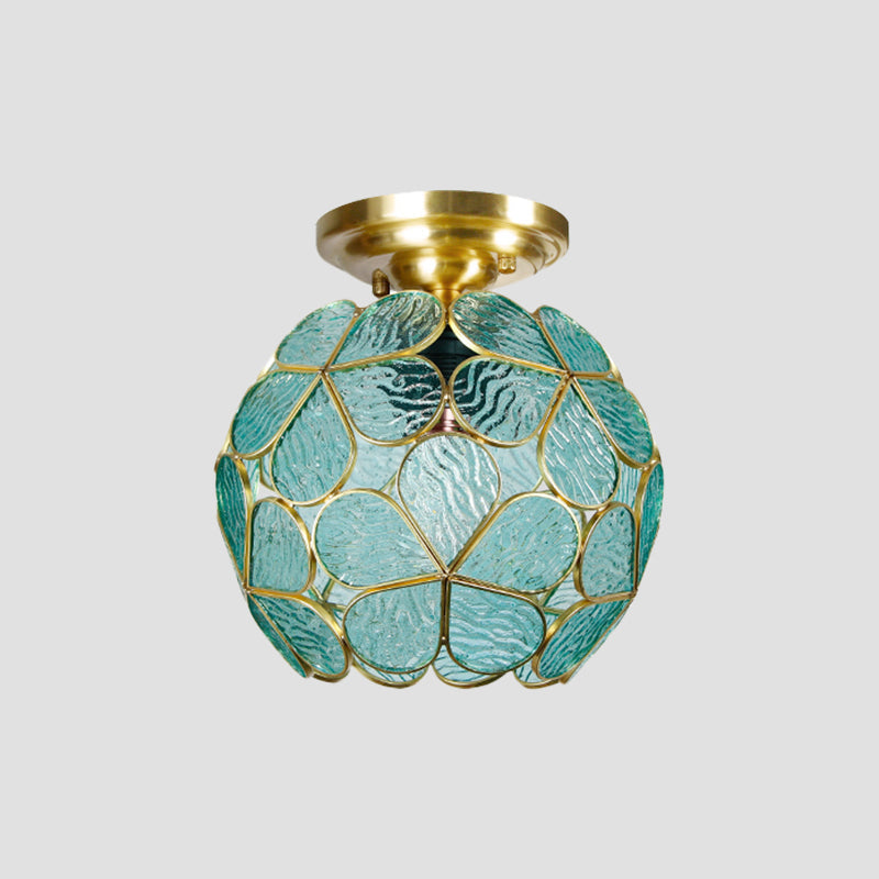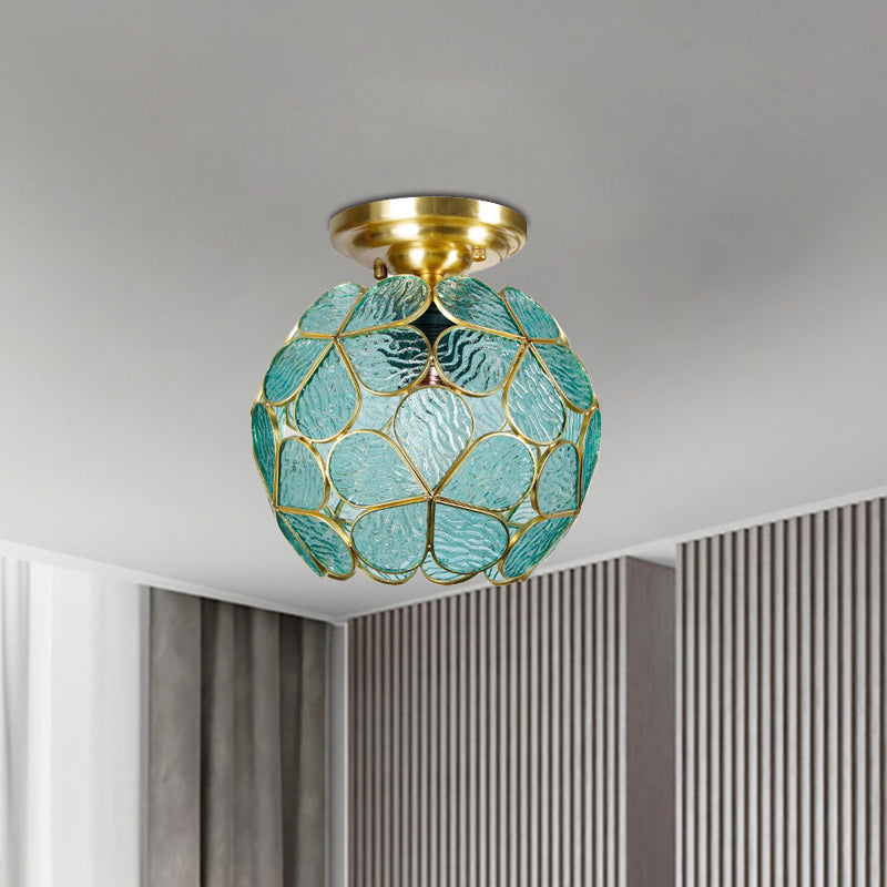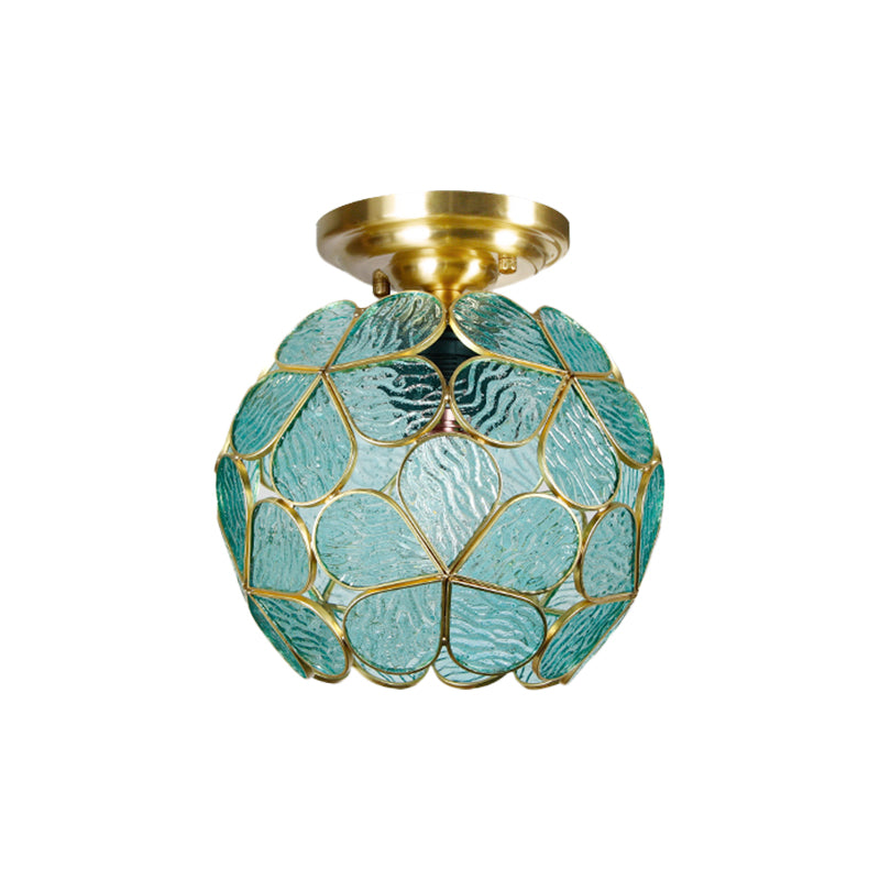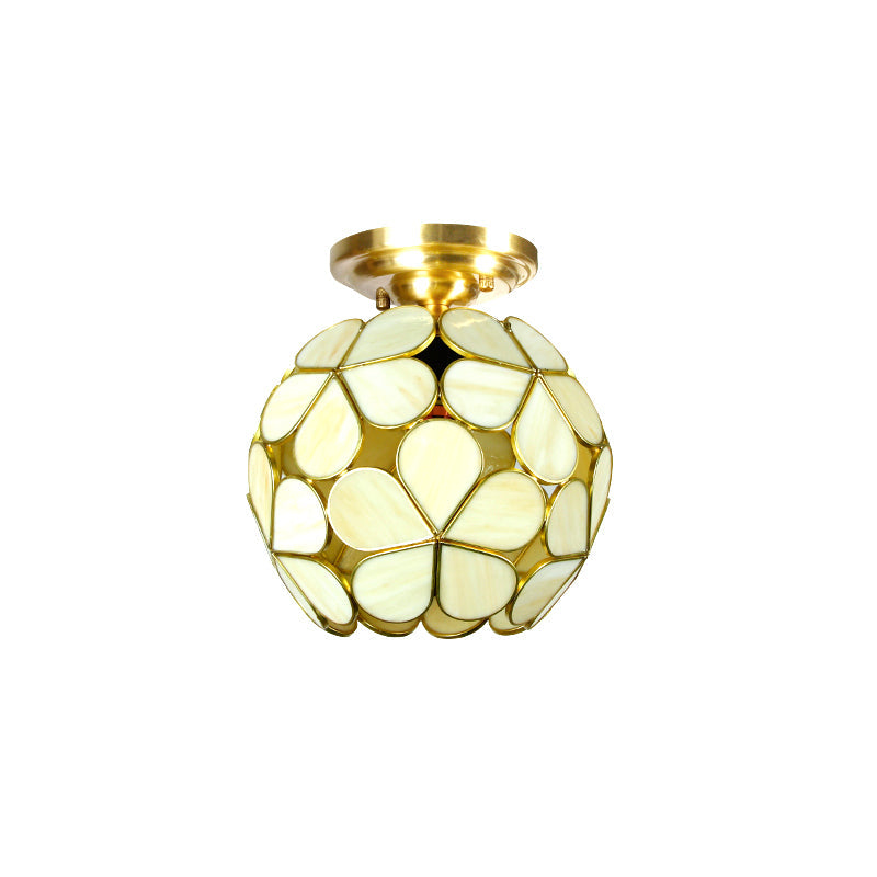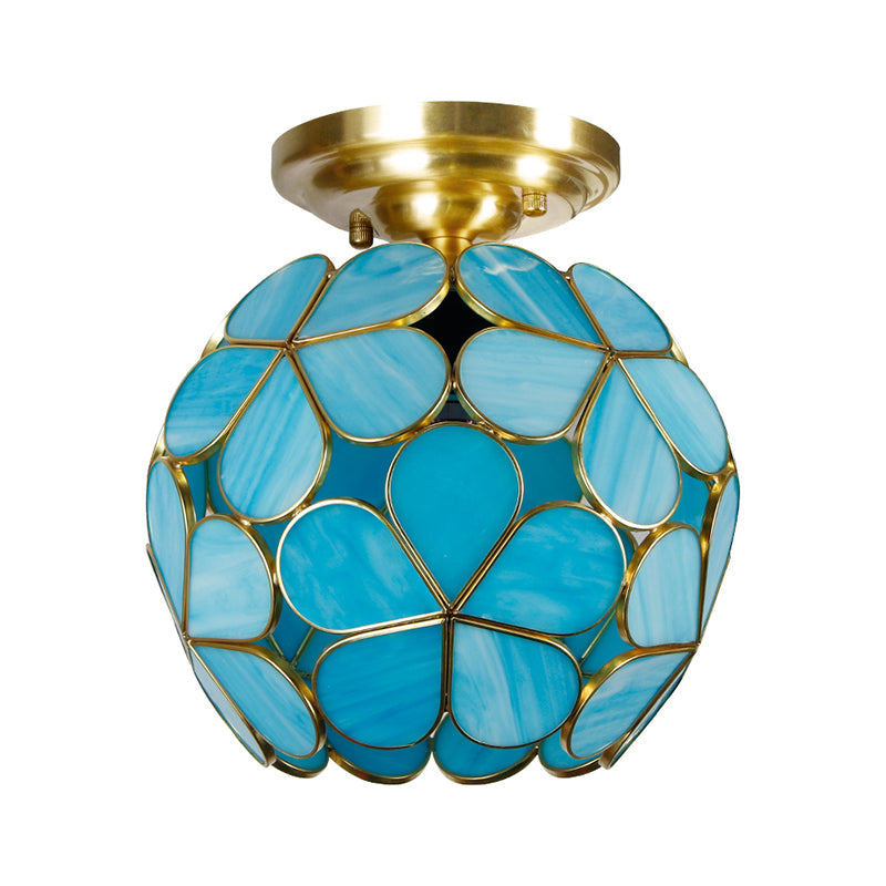 This Single Light Flower Ceiling Fixture is the perfect addition for a Victorian-style home décor. The glasswork is intricately designed with a unique flower pattern. It is handmade with the finest stained glass materials in the shades of white, pink, orange and blue. It has a classic semi-flush mount design, giving a luxurious and glamorous look to your home. The individually crafted pieces of metal act as a strong frame for the glass fixture. The size of the product is 5 to 9 inches, with a fixture width of 8 inches and a fixture height of 9 inches.