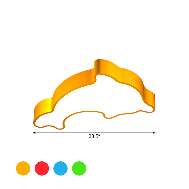 This is a Dolphin Nursery LED Ceiling Lamp. It is made of acrylic and is in the shape of a cartoon dolphin. It is available in red, yellow, and blue. It is 19.5" wide and 23.5" long. It comes with a bulb and is LED.