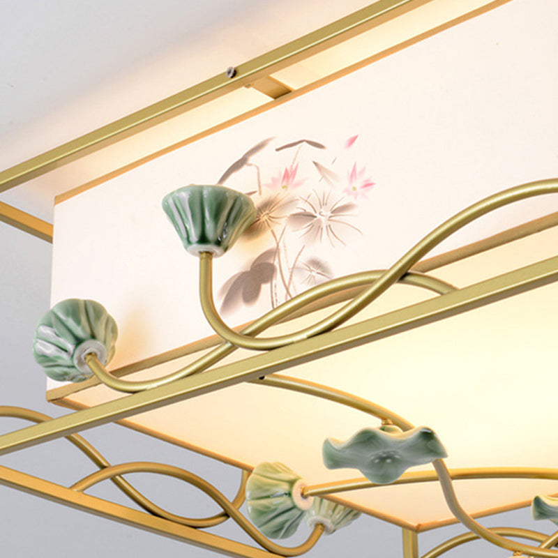 This is a ceiling-mounted light fixture measuring 23.5" x 19.5" and 8.5" tall. It features a traditional design with a white fabric shade. The light bulb is not included. It is rated for 5 lights but can use LED, incandescent, or fluorescent bulbs up to 220-240V or 110-120V.