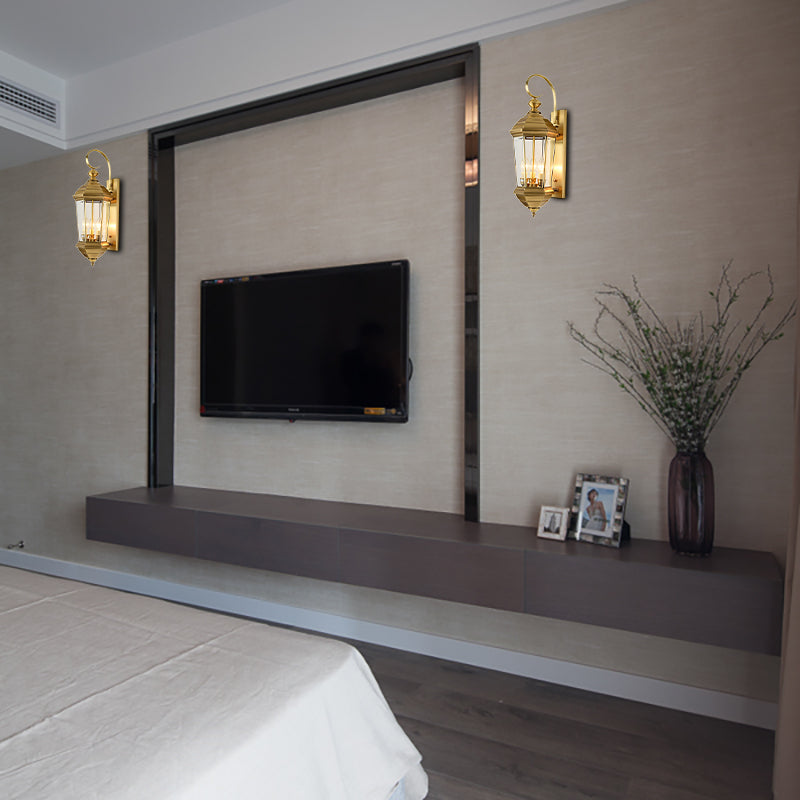 This lantern wall sconce light is made of metal with a gold finish. It has 1 light and a traditional colonial style. It is certified for indoor use only. The lantern is 23 inches high, 8.5 inches wide, and 9.5 inches deep. The light bulb is not included but it takes an E26/E27 bulb.