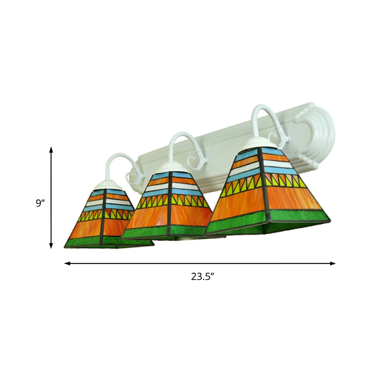 In short, the Pyramid wall mount light features a classic mission style design and comes in a three-color combination of pink, orange and blue stained glass. It is suitable for both indoor and outdoor use, supports multiple light types, can be used with domestic and international voltage and measures 23.5 inch in width and 9 inch in height. This wall lamp provides light and beauty that will uplift any room's atmosphere.