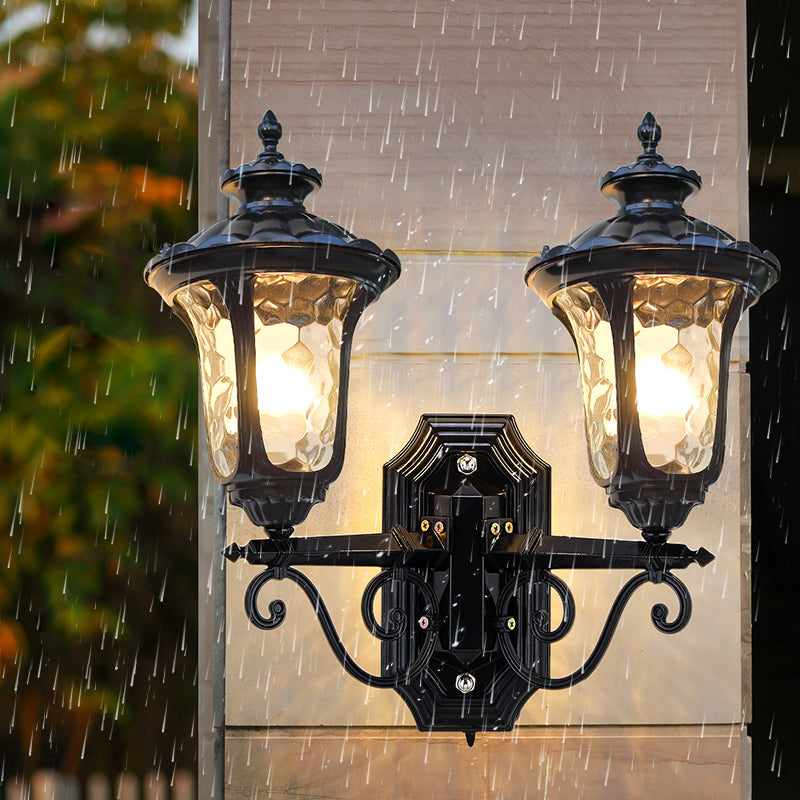 Vintage Black Lantern Wall Mount Lighting with Clear Glass - Curved Arm Design, 2 Bulbs