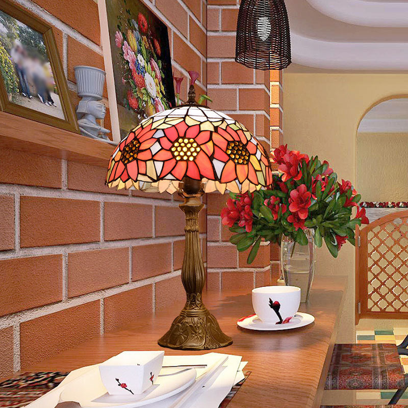 This Tiffany-style nightstand lamp has an orange stained glass shade with a sunflower pattern. The shade is 8 inches high and the fixture is 16 to 20 inches high. The metal base is finished in orange and the lamp takes one lightbulb (not included). The lightbulb base is an E26/E27 and the voltage is 220V-240V 110V-120V.