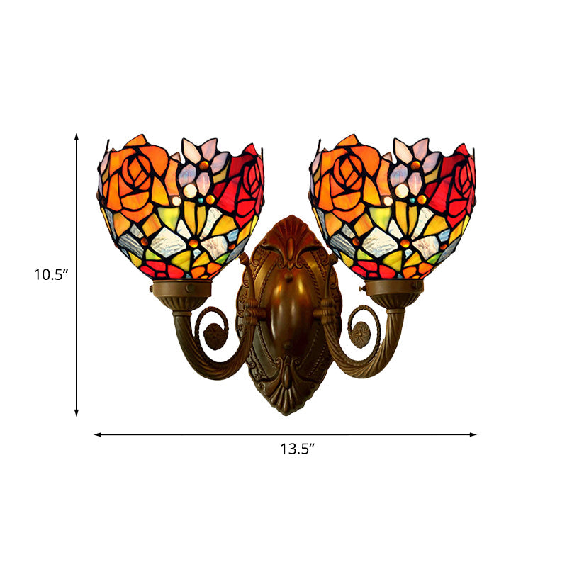 Bronze Tiffany Rose Stained Glass Wall Sconce with Bowl Shade - 2-Light Wall Lamp