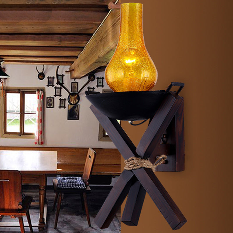 Rustic Amber Crackle Glass Black Sconce Light with Wall Mount - 1-Light