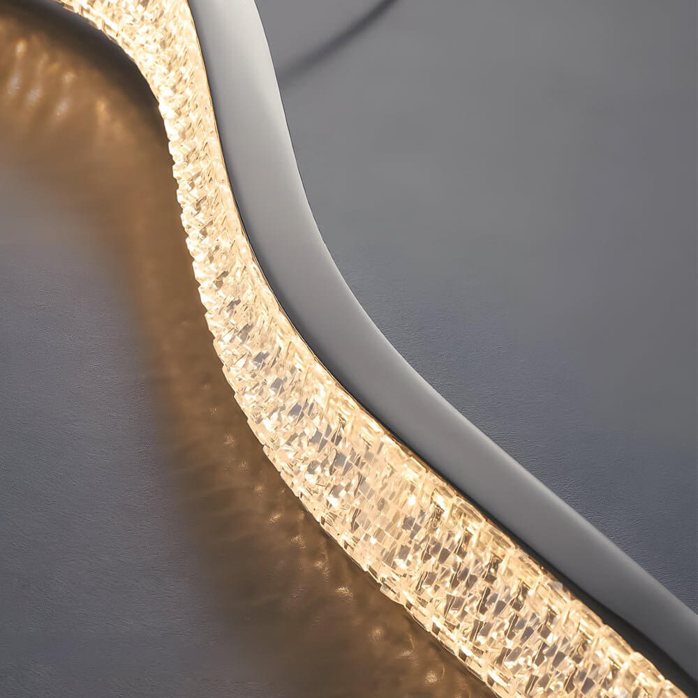 The 1-Light Black Wave Linear LED Pendant Light introduces a bold, contemporary look to kitchens and dining spaces. Its ribbon-inspired wave silhouette features an electroplated black aluminum body paired with a crystal-like acrylic shade, producing a striking blend of artistry and function. Adjustable hanging cords allow versatile placement, while dimmable LED technology provides customizable illumination. Ideal for kitchen islands and dining areas, this modern wave pendant becomes an eye-catching centerpiece.
