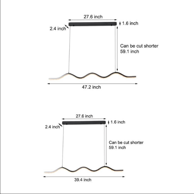 • Distinctive wave ribbon design with electroplated black aluminum finish • Light Source: LED bulbs (inbuilt and included) • Available in 39.4" and 47.2" sizes • Adjustable hanging height with dual 59.1" wire cords • 3-step color temperature control (3000K / 4500K / 6000K) via wall switch • Remote-controlled dimming for brightness and color temperature (3000K–6000K) • Long-lasting LED performance with modern artistic appeal