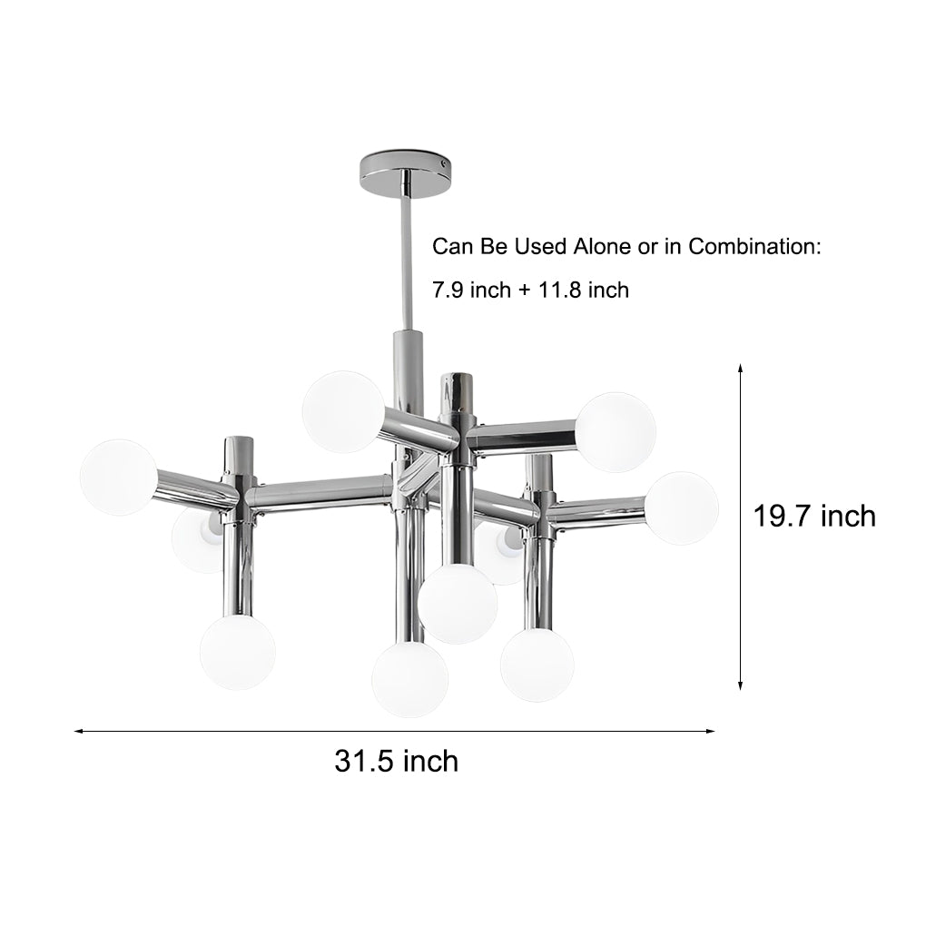 KEY FEATURES • Modern sputnik-style design with ten luminous glass globes • Durable iron and aluminum frame with polished chrome finish for a sleek, contemporary look • Supports E27 bulb base (bulbs not included) for customizable lighting • Compatible with warm white 3000 K or white 6000 K bulbs • Rustproof, wear-resistant construction with fine polishing for long-lasting beauty • Voltage: 110–240 V (non-polarized) • Working Temperature: –20 °C to 60 °C